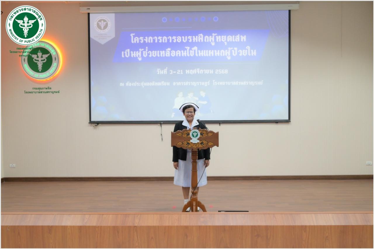 นายแพทย์ธิติพันธ์ ธานีรัตน์ ผู้อำนวยการโรงพยาบาลสวนสราญรมย์ มอบหมายให้ กลุ่มภารกิจการพยาบาลร่วมกับคณะกรรมการขับเคลื่อนยุทธศาสตร์ที่ 2 และยุทธศาสตร์ที่ 3 จัดอบรมฝึกผู้หยุดเสพเป็นผู้ช่วยเหลือคนไข้ในแผนกผู้ป่วยใน โดยมี นางสาวตันติมา ด้วงโยธา รองผู้อำนวยการฝ่ายการพยาบาล เป็นประธาน และ นางสาวพรประไพ แขกเต้า พยาบาลวิชาชีพชำนาญการพิเศษ เป็นผู้กล่าวรายงาน มีวัตถุประสงค์เพื่อพัฒนาศักยภาพของผู้ป่วยจิตเวชและยาเสพติดที่ได้รับการบำบัดรักษาให้เป็นผู้ช่วยเหลือคนไข้ และเพื่อลดการกลับไปเสพยาในผู้ที่ฟื้นฟูแล้ว การอบรมแบ่งออกเป็น 2 ระยะ โดยมีผู้เข้าร่วมทั้งสิ้น 29 คน ประกอบด้วย ภาคทฤษฎี ระหว่างวันที่ 3 - 7 พฤศจิกายน 2568 ณ ห้องประชุมออดิทอเรียมและห้องประชุม 3/1 อาคารสราญราษฎร์ โรงพยาบาลสวนสราญรมย์ จังหวัดสุราษฎร์ธานี และภาคปฏิบัติ ระหว่างวันที่ 10 - 21 พฤศจิกายน 2568 โดยให้ผู้เข้าอบรมฝึกปฏิบัติงานจริงที่หอผู้ป่วยในโรงพยาบาล เพื่อสร้างประสบการณ์และความมั่นใจในการทำงาน