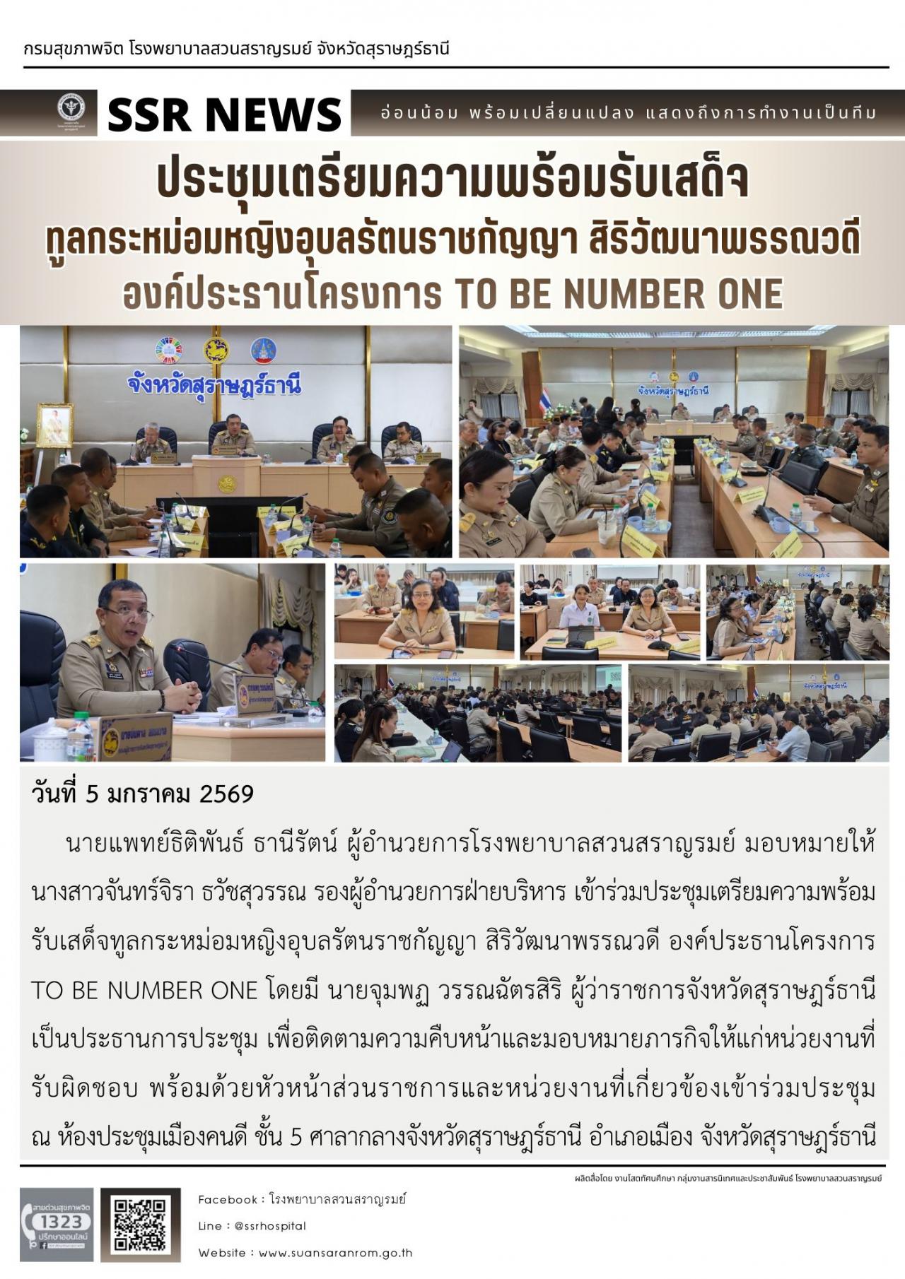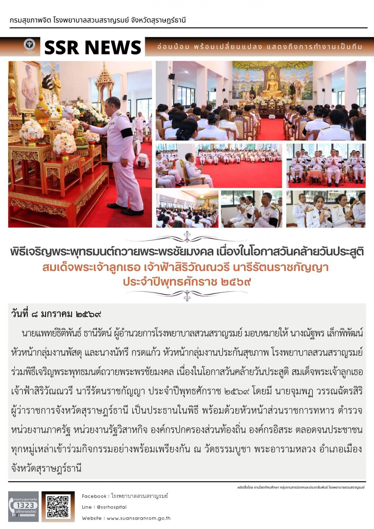 นายแพทย์ธิติพันธ์ ธานีรัตน์ ผู้อำนวยการโรงพยาบาลสวนสราญรมย์ มอบหมายให้ นางมนัสนันท์ เวสนุสิทธิ์ หัวหน้ากลุ่มงานเทคนิคการแพทย์ และบุคลากรกลุ่มภารกิจบริการจิตเวชและสุขภาพจิต โรงพยาบาลสวนสราญรมย์ ร่วมในกิจกรรมสวดมนต์และปฏิบัติธรรมข้ามปีใหม่ บริสุทธิ์ด้วยใจ ถวายพระราชกุศล พุทธศักราช ๒๕๖๙ เพื่อถวายเป็นพระราชกุศล แด่สมเด็จพระนางเจ้าสิริกิติ์ พระบรมราชินีนาถ พระบรมราชชนนีพันปีหลวง และส่งเสริมให้พุทธศาสนิกชนทุกหมู่เหล่า ร่วมเฉลิมฉลองเนื่องในโอกาสวันขึ้นปีใหม่ โดยพร้อมกับสมาทานศีล สวดมนต์ และเจริญจิตตภาวนาส่งท้ายปีเก่าต้อนรับปีใหม่ด้วยชีวิตที่งดงาม โดยมี นายจุมพฏ วรรณฉัตรสิริ ผู้ว่าราชการจังหวัดสุราษฎร์ธานี เป็นประธานในพิธี พร้อมด้วย หัวหน้าส่วนราชการ หัวหน้าหน่วยงาน รัฐวิสาหกิจ ภาคเอกชนและพุทธศาสนิกชน เข้าร่วมในพิธี ณ พระอุโบสถ วัดธรรมบูชา พระอารามหลวง อำเภอเมืองสุราษฎร์ธานี จังหวัดสุราษฎร์ธานี