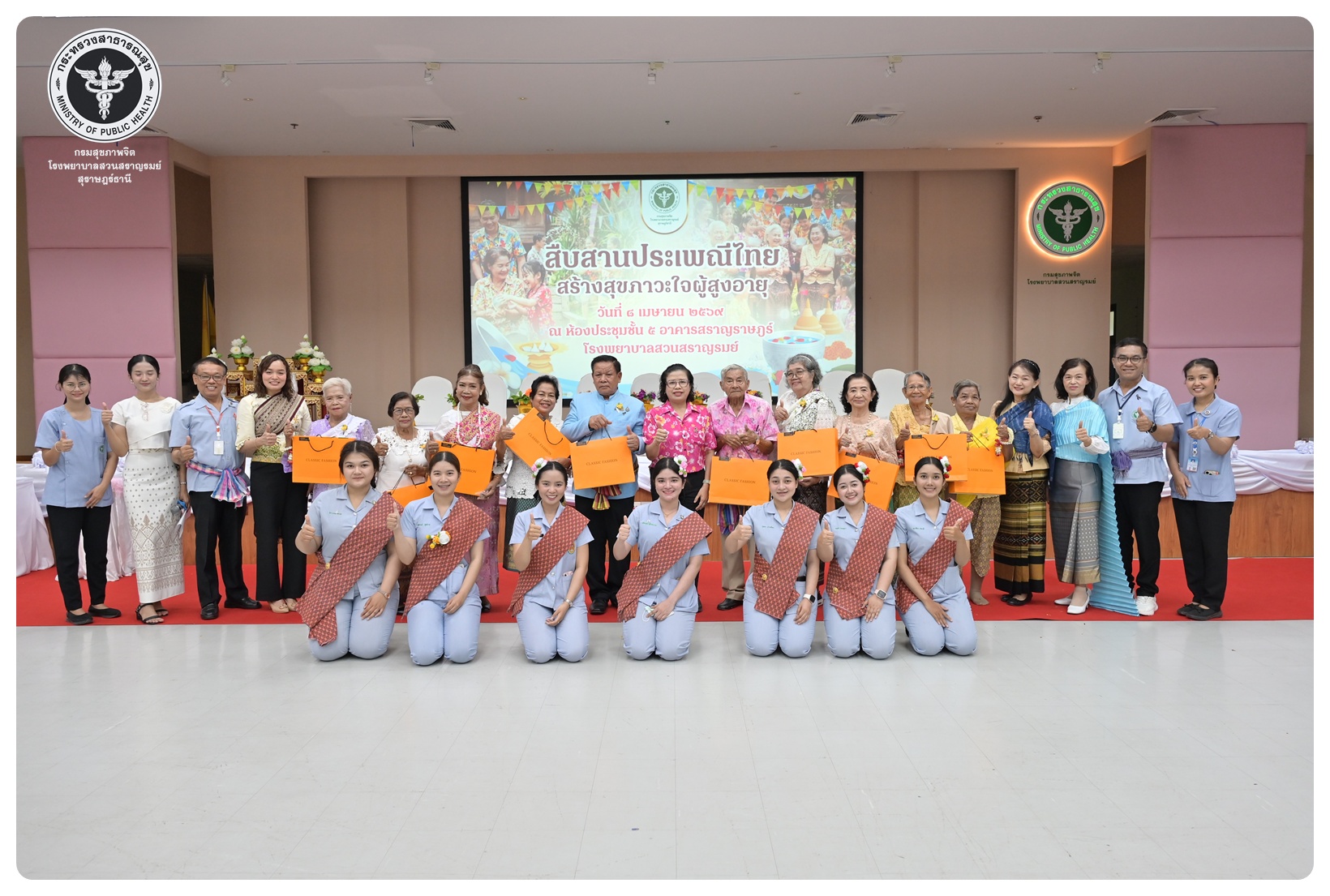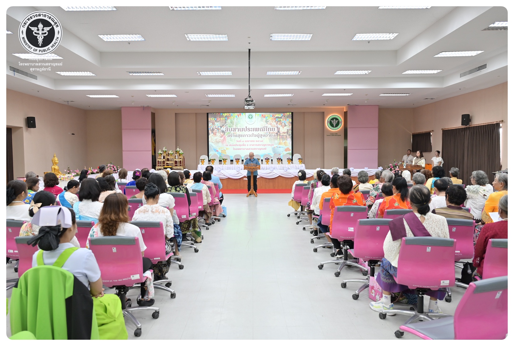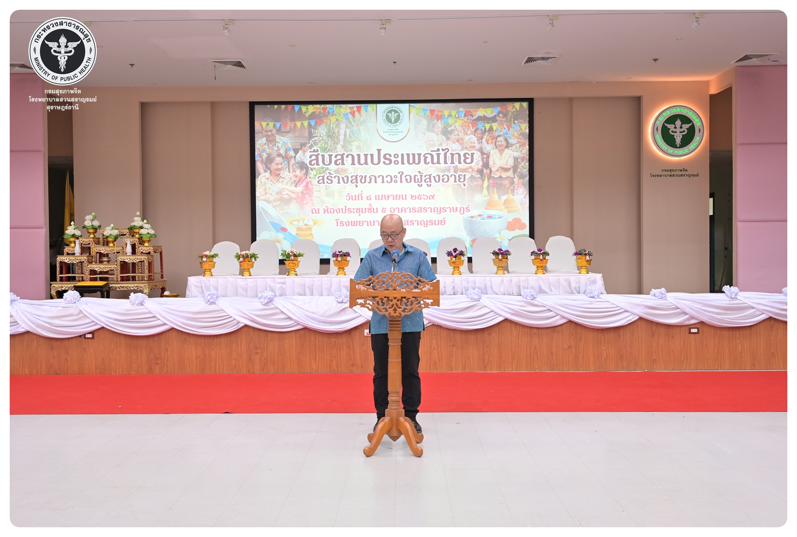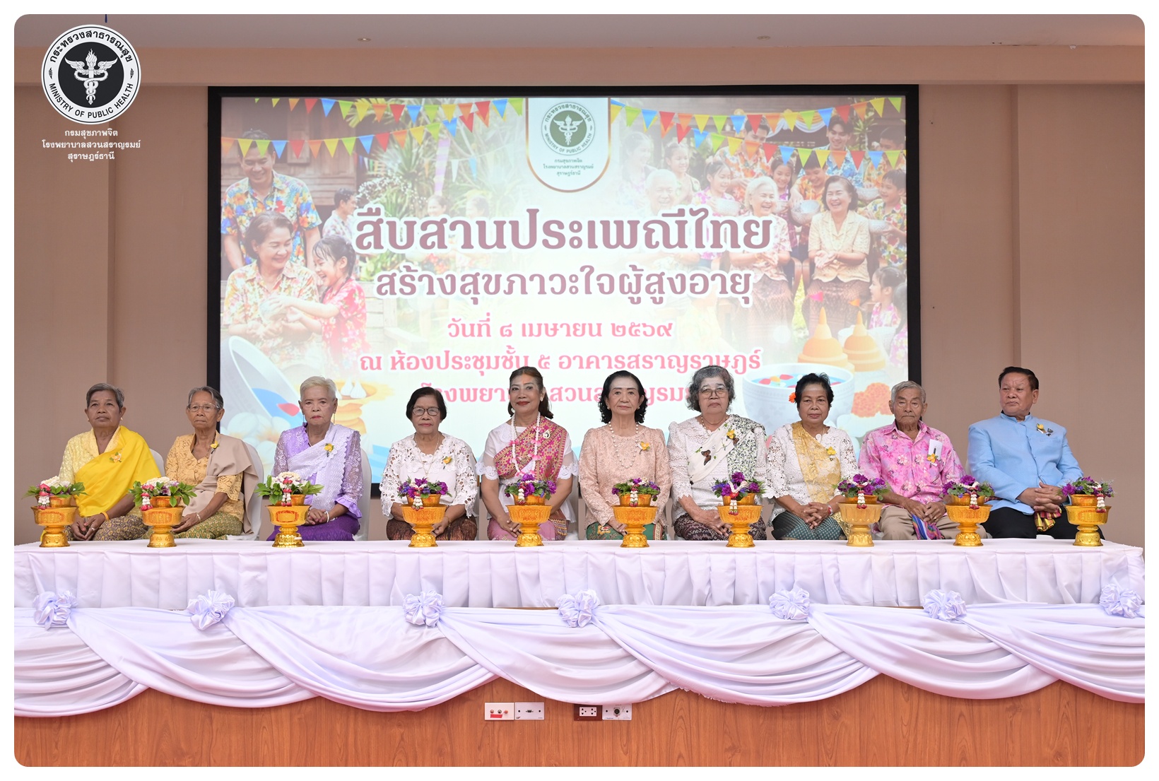 นายแพทย์ธิติพันธ์ ธานีรัตน์ ผู้อำนวยการโรงพยาบาลสวนสราญรมย์ มอบหมายให้ นายปราโมทย์ ศรีโพธิ์ชัย รองผู้อำนวยการฝ่ายพัฒนาคุณภาพองค์กรและความเป็นเลิศ เป็นประธานในพิธีเปิดโครงการพัฒนาเสริมสร้างความรอบรู้สุขภาพจิต โรงพยาบาลสวนสราญรมย์ กิจกรรมที่ ๓ กิจกรรมสืบสานประเพณีไทยสร้างสุขภาวะใจผู้สูงวัย โดยมี ดร.อุไรวรรณ เกิดสังข์ นักสังคมสงเคราะห์เชี่ยวชาญ เป็นผู้กล่าวรายงาน ภายใต้ความร่วมมือของคณะกรรมการพัฒนาความรอบรู้สุขภาพจิต และคณะกรรมการขับเคลื่อนงานสูงอายุ มีวัตถุประสงค์เพื่อแสดงถึงความรัก ความกตัญญู ความเคารพนับถือ และอนุรักษ์วัฒนธรรม ประเพณีสงกรานต์ไทยอันดีงามสืบไป โดยจัดกิจกรรมสรงน้ำพระ รดน้ำขอพรผู้สูงอายุ และแลกเปลี่ยนเรียนรู้ ผ่านบูทกิจกรรมชะลอเสื่อม จำนวน 5 บูท ผู้เข้าร่วมกิจกรรม ได้แก่ สมาชิกชมรมผู้สูงอายุต่าง ๆ ในจังหวัดสุราษฎร์ธานี นักศึกษาพยาบาลคณะพยาบาลศาสตร์ มหาวิทยาลัยราชภัฏสุราษฎร์ธานีและบุคลากรโรงพยาบาลสวนสราญรมย์ จำนวน 150 คน ณ ห้องประชุมชั้น 5 อาคารสราญราษฎร์ โรงพยาบาลสวนสราญรมย์ อำเภอพุนพิน จังหวัดสุราษฎร์ธานี