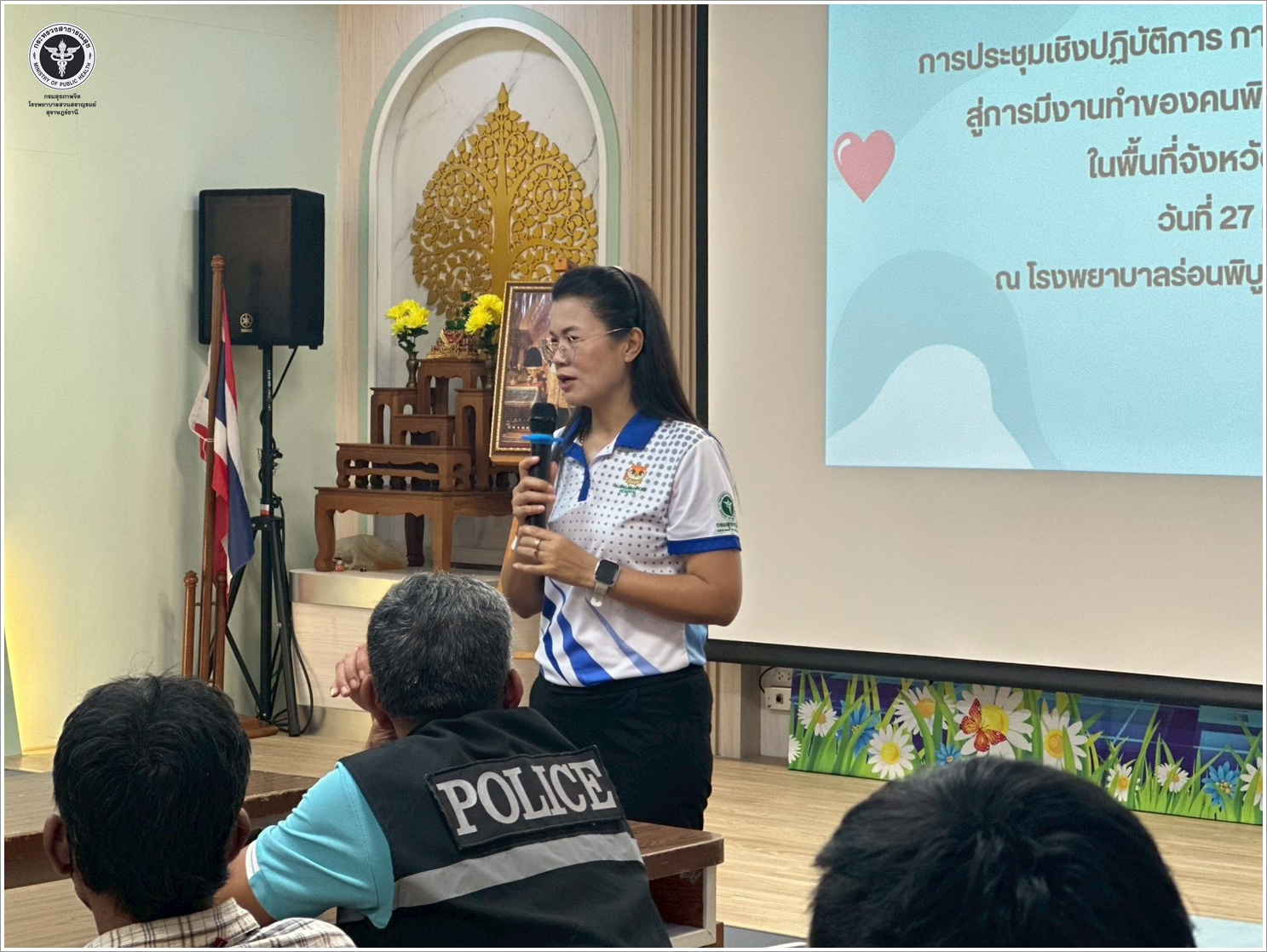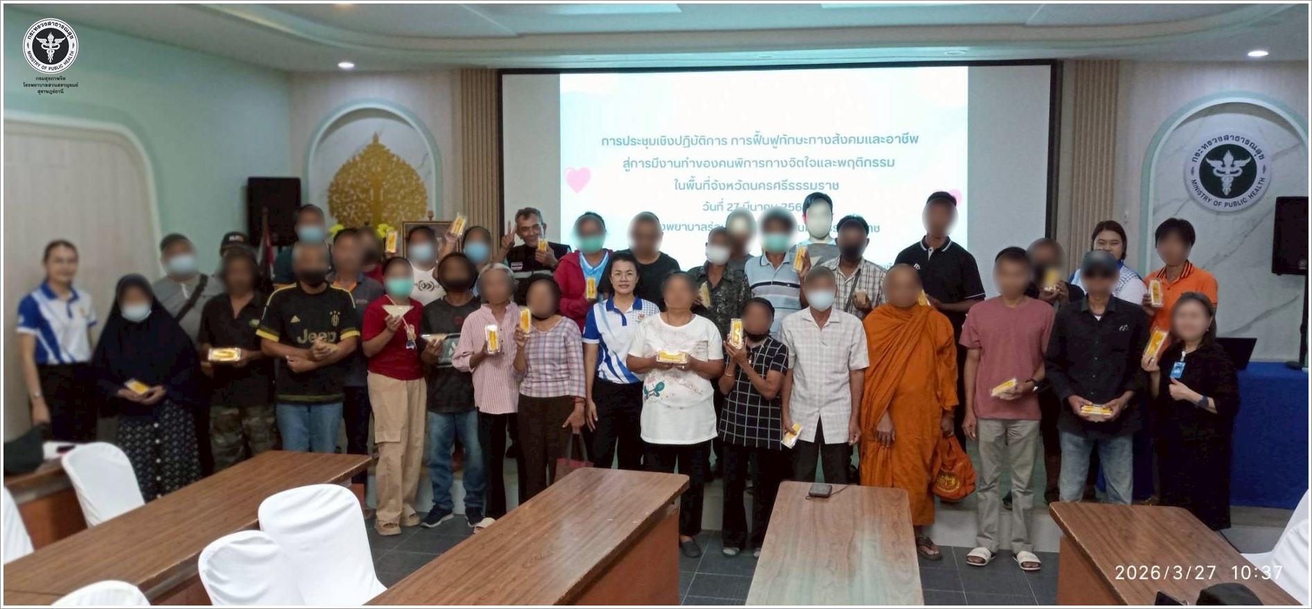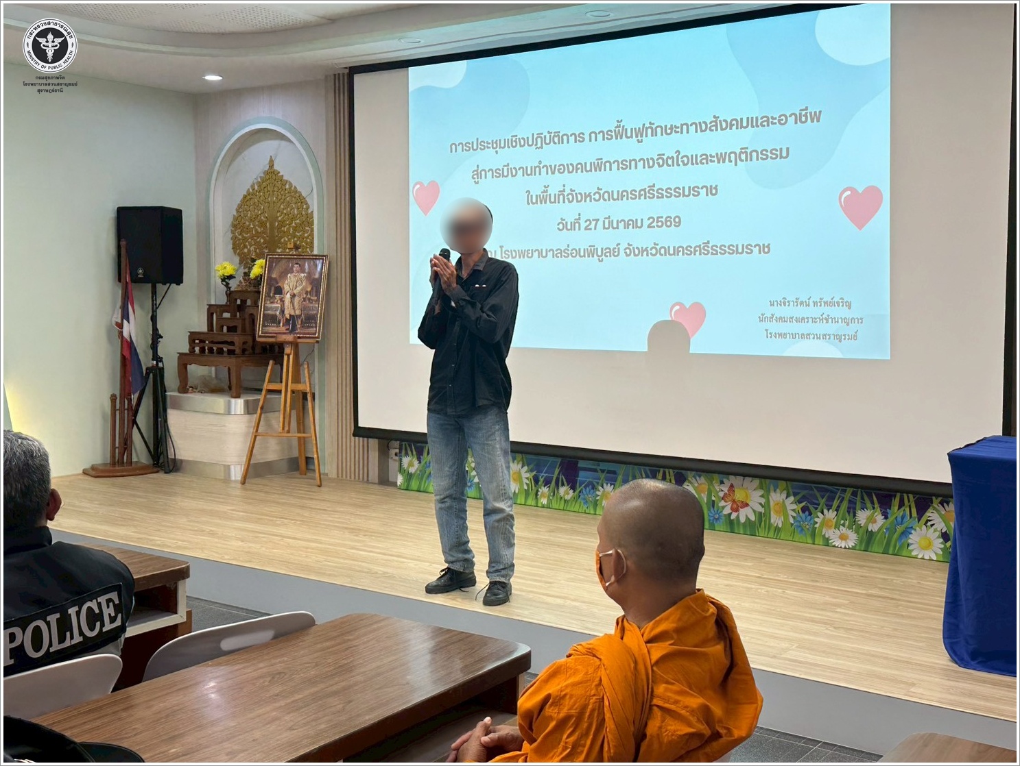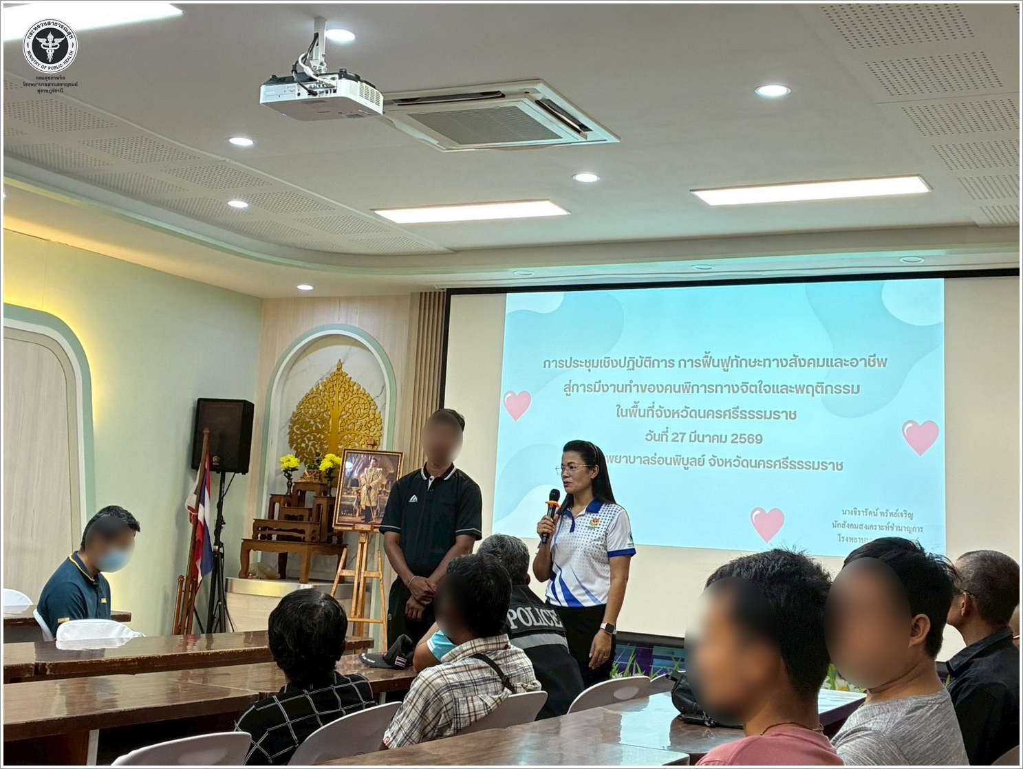 นายแพทย์ธิติพันธ์ ธานีรัตน์ ผู้อำนวยการโรงพยาบาลสวนสราญรมย์ มอบหมายให้ กลุ่มงานสังคมสงเคราะห์ จัดโครงการขับเคลื่อนและป้องกัน เฝ้าระวัง บำบัดรักษา ฟื้นฟู ดูแลต่อเนื่อง ผู้ป่วยจิตเวชหรือยาเสพติดกลุ่มเสี่ยงต่อการก่อความรุนแรง (SMI-V) ในเขตสุขภาพที่ ๑๑ ปีงบประมาณ ๒๕๖๙ กิจกรรมที่ ๓ พัฒนาระบบการฟื้นฟูทักษะทางสังคมและอาชีพสู่การมีงานทำของคนพิการทางจิตใจหรือพฤติกรรม มีวัตถุประสงค์เพื่อ ๑) เพื่อพัฒนาความรู้ ทักษะทางสังคม และทักษะอาชีพของผู้เข้าร่วม ให้มีความพร้อมในการเข้าสู่การทำงานได้อย่างเหมาะสม 2) เพื่อเสริมสร้างความมั่นใจ แรงจูงใจ และทัศนคติที่ดีต่อการประกอบอาชีพ อันนำไปสู่การพึ่งตนเองได้ และ ๓) เพื่อส่งเสริมให้ผู้เข้าร่วมสามารถนำความรู้และทักษะไปประยุกต์ใช้ในการประกอบอาชีพและดำรงชีวิตในสังคมได้อย่างเหมาะสม ภายในกิจกรรมมีการบรรยายให้ความรู้ทั่วไปเกี่ยวกับกฎหมายและสิทธิสวัสดิการสำหรับคนพิการทางจิตใจหรือพฤติกรรม การฝึกปฏิบัติการฟื้นฟูสมรรถภาพทางสังคมเรื่องทักษะด้านการสื่อสาร/ทักษะการผ่อนคลายและการจัดการกับอารมณ์สำหรับคนพิการทางจิตใจหรือพฤติกรรม การฟื้นฟูสมรรถภาพทางสังคมเรื่องการอยู่อาศัยในชุมชน ทักษะด้านการสื่อสารที่เหมาะสมสำหรับคนพิการทางจิตใจหรือพฤติกรรม และทักษะการประกอบอาชีพเพื่อเลี้ยงตนเองได้อย่างเหมาะสมกับศักยภาพของตนเอง กลุ่มเป้าหมาย คือ คนพิการทางจิตใจหรือพฤติกรรมและผู้ดูแลคนพิการ จำนวน ๓๐ คน ณ ห้องประชุมพีระ คงทอง โรงพยาบาลร่อนพิบูลย์ อำเภอร่อนพิบูลย์ จังหวัดนครศรีธรรมราช