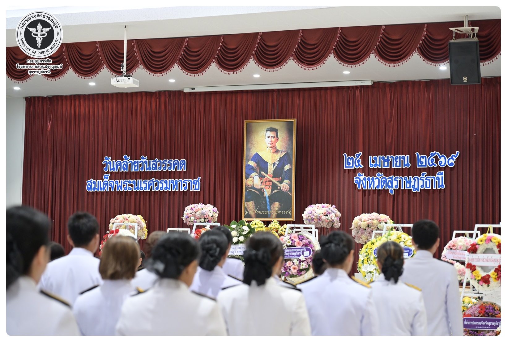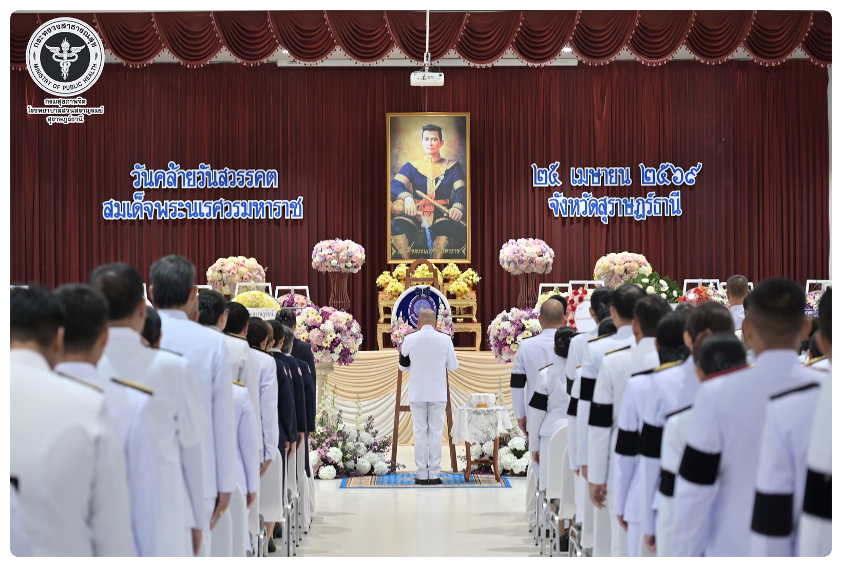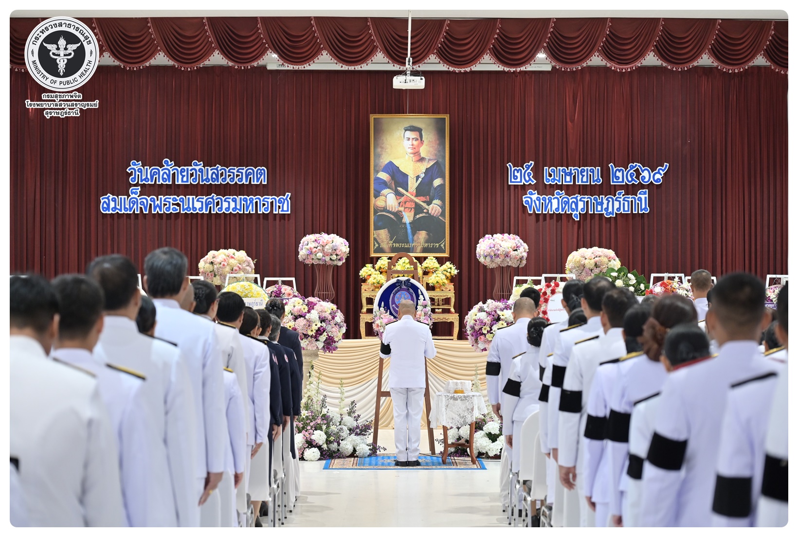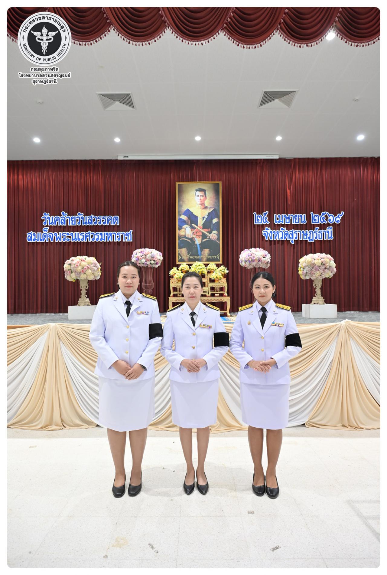 นายแพทย์ธิติพันธ์ ธานีรัตน์ ผู้อำนวยการโรงพยาบาลสวนสราญรมย์ มอบหมายให้ นางยุวดี เชื้อชิตวงษ์ นักรังสีการแพทย์ชำนาญการ และบุคลากรโรงพยาบาลสวนสราญรมย์ ร่วมพิธีวางพวงมาลาถวายราชสักการะ และกล่าวคำถวายอาศิรวาทราชสดุดีเฉลิมพระเกียรติ เนื่องในวันคล้ายวันสวรรคต สมเด็จพระนเรศวรมหาราช ประจำปี ๒๕๖๘ โดยมี นายกล้าณรงค์ ยุติธรรม รองผู้ว่าราชการจังหวัดสุราษฎร์ธานี เป็นประธานในพิธี พร้อมด้วยหัวหน้าส่วนราชการทหาร ตำรวจ หน่วยงานภาครัฐ หน่วยงานรัฐวิสาหกิจ องค์กรปกครองส่วนท้องถิ่น องค์กรอิสระ องค์กรวิชาชีพ และผู้แทนสมาคม เข้าร่วมกิจกรรมอย่างพร้อมเพรียงกัน เพื่อน้อมรำลึกในพระมหากรุณาธิคุณอันหาที่สุดมิได้ ณ อาคารศูนย์กลาง การประชุมสัมมนาภาคใต้ตอนบน ศาลากลางจังหวัดสุราษฎร์ธานี อำเภอเมือง จังหวัดสุราษฎร์ธานี