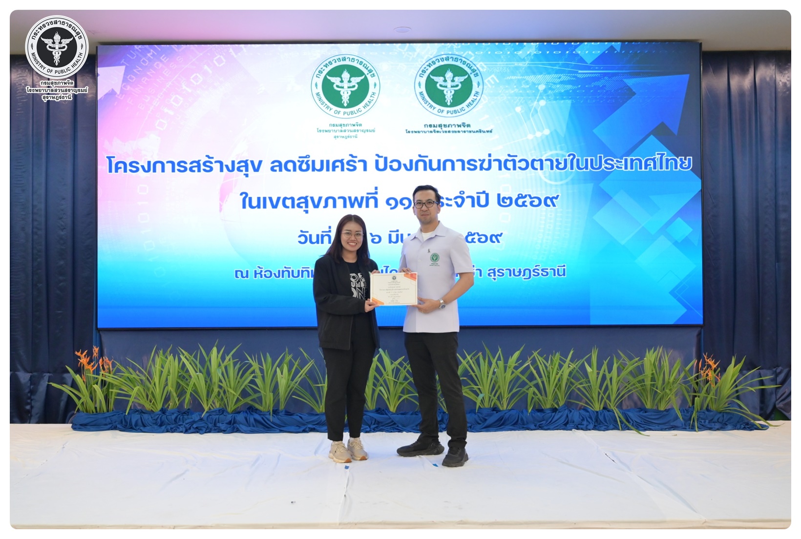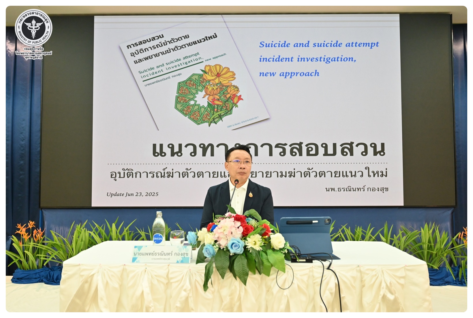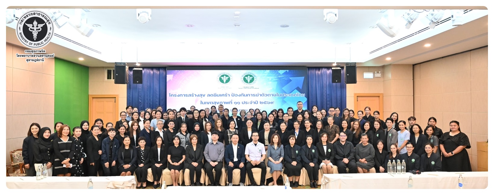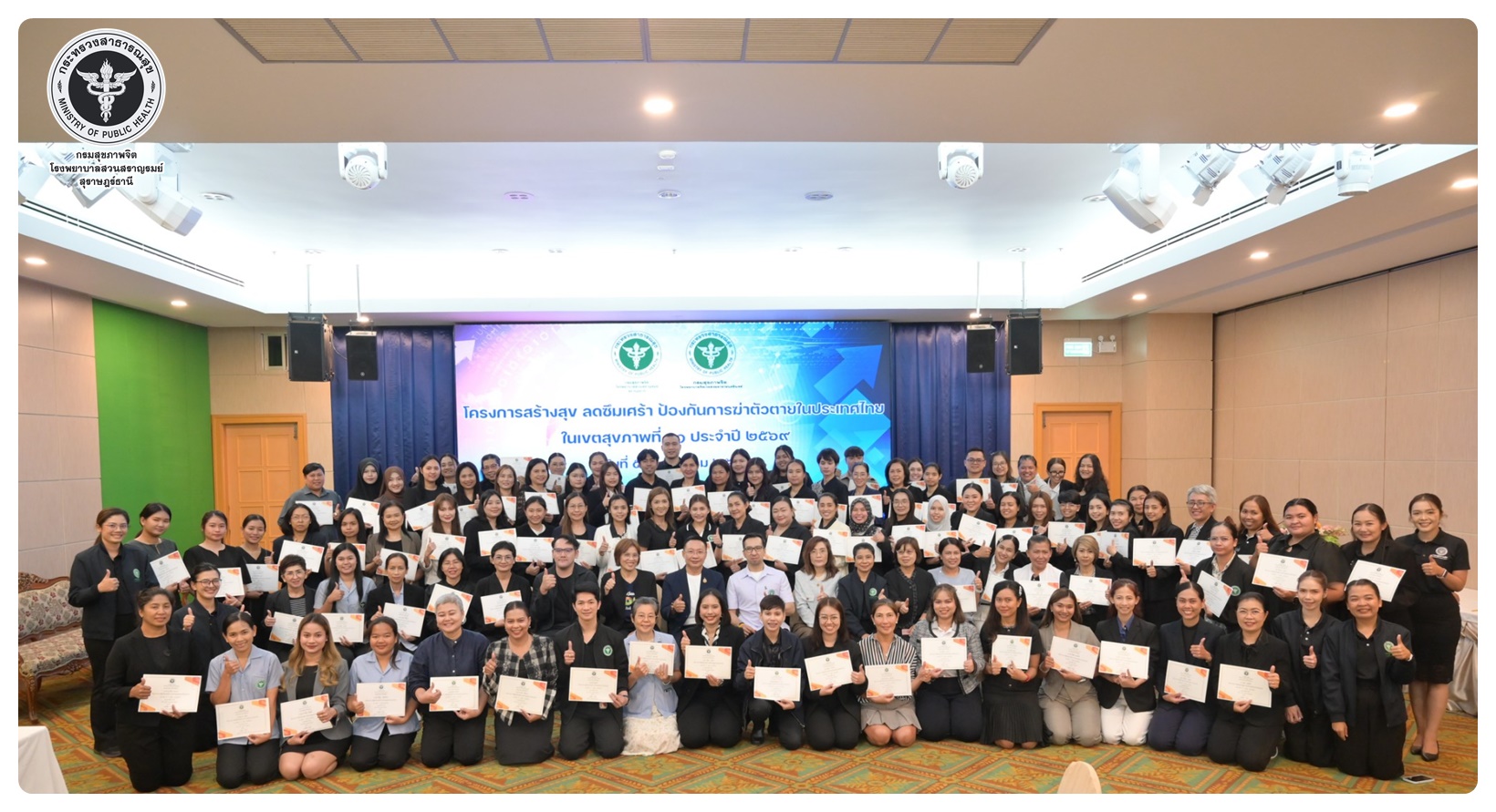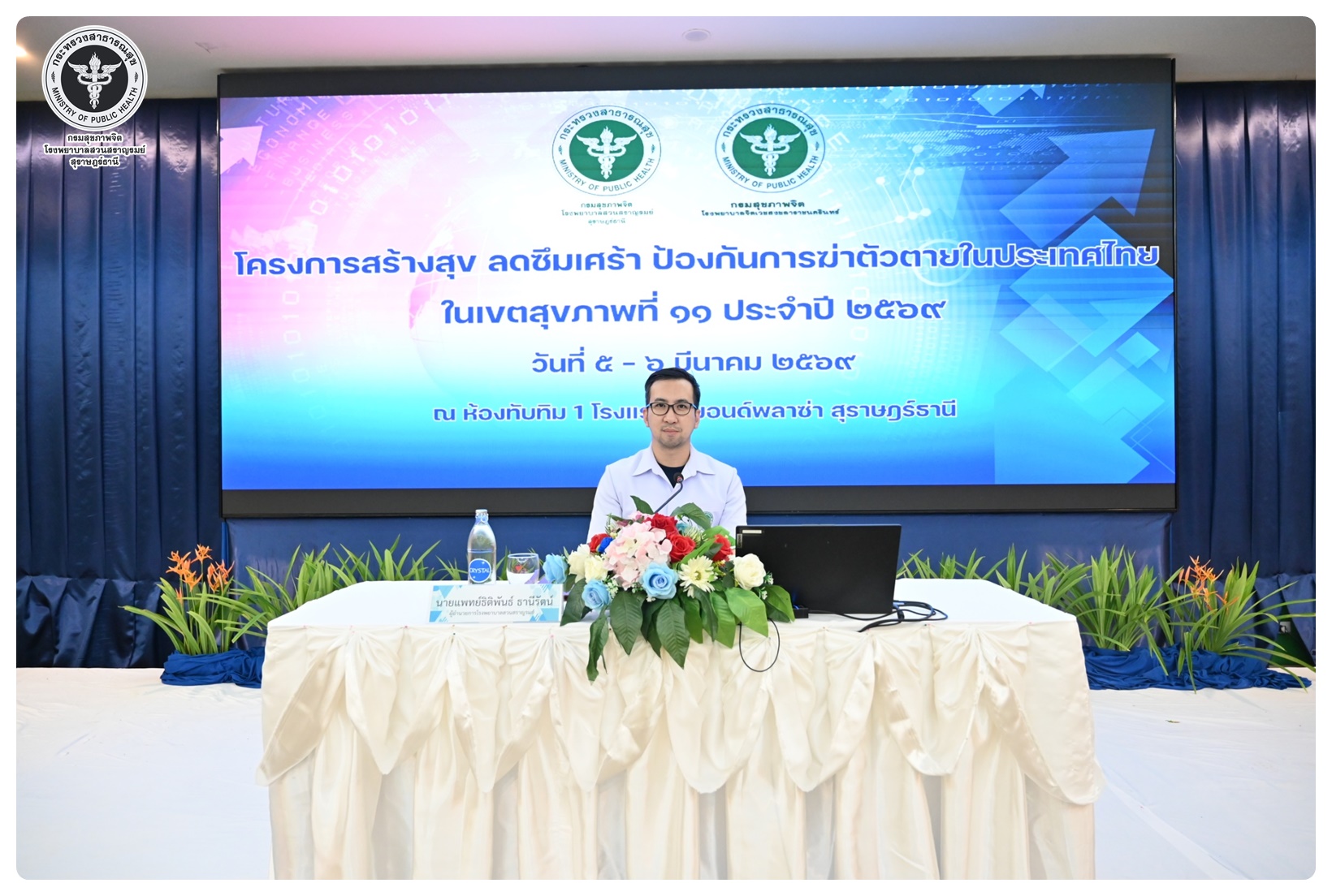 นายแพทย์ธิติพันธ์ ธานีรัตน์ ผู้อำนวยการโรงพยาบาลสวนสราญรมย์ เป็นประธานในโครงการสร้างสุข ลดซึมเศร้า ป้องกันการฆ่าตัวตายในประเทศไทย ในเขตสุขภาพที่ 11 กิจกรรมที่ 1 ประชุมเชิงปฏิบัติการพัฒนาศักยภาพบุคลากรและขับเคลื่อนการดูแลผู้ป่วยโรคซึมเศร้าและป้องกันแก้ไขปัญหาการฆ่าตัวตายในเขตสุขภาพที่ 11 โดยมี นายแพทย์ไพโรจน์ เสรีเด่นชัย นายแพทย์ชำนาญการ ประธานคณะกรรมการขับเคลื่อนยุทธศาสตร์ที่ 3 เป็นผู้กล่าวรายงาน พร้อมด้วย นายแพทย์ธรณินทร์ กองสุข นายแพทย์ทรงคุณวุฒิ ให้เกียรติเป็นวิทยากรหลักในการบรรยาย มีวัตถุประสงค์เพื่อเพิ่มศักยภาพ บุคลากรสาธารณสุขในพื้นที่ 7 จังหวัด ให้มีความรู้ ความเข้าใจ และทักษะในการคัดกรอง เฝ้าระวัง ดูแล และส่งต่อผู้ป่วยโรคซึมเศร้าและการสอบสวนโรคในผู้พยายามฆ่าตัวตายได้อย่างเหมาะสม ผู้เข้าร่วมประชุมประกอบด้วย ผู้รับผิดชอบงานสุขภาพจิตและยาเสพติดใน สสจ. รพศ. รพท. รพช. รพ.สต. ในเขตสุขภาพที่ 11 จำนวน 120 คน การประชุมจัดในรูปแบบการบรรยาย และการฝึกภาคปฏิบัติ ณ ห้องประชุมทับทิม 1 โรงแรมไดมอนต์ พลาซ่า อำเภอเมือง จังหวัดสุราษฎร์ธานี