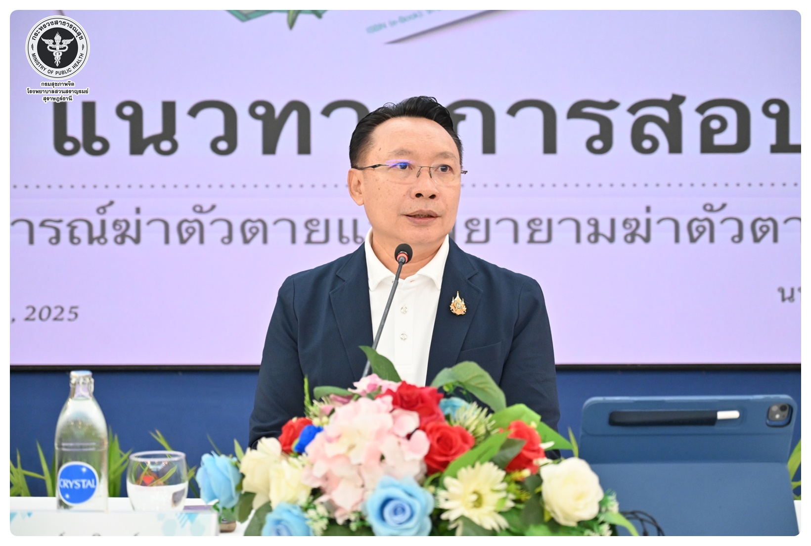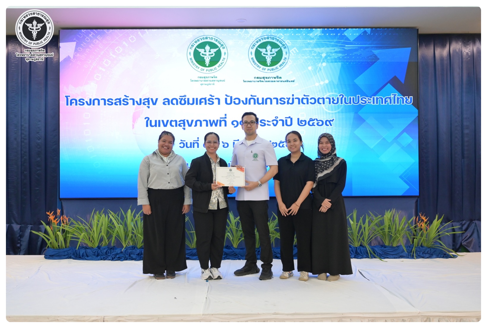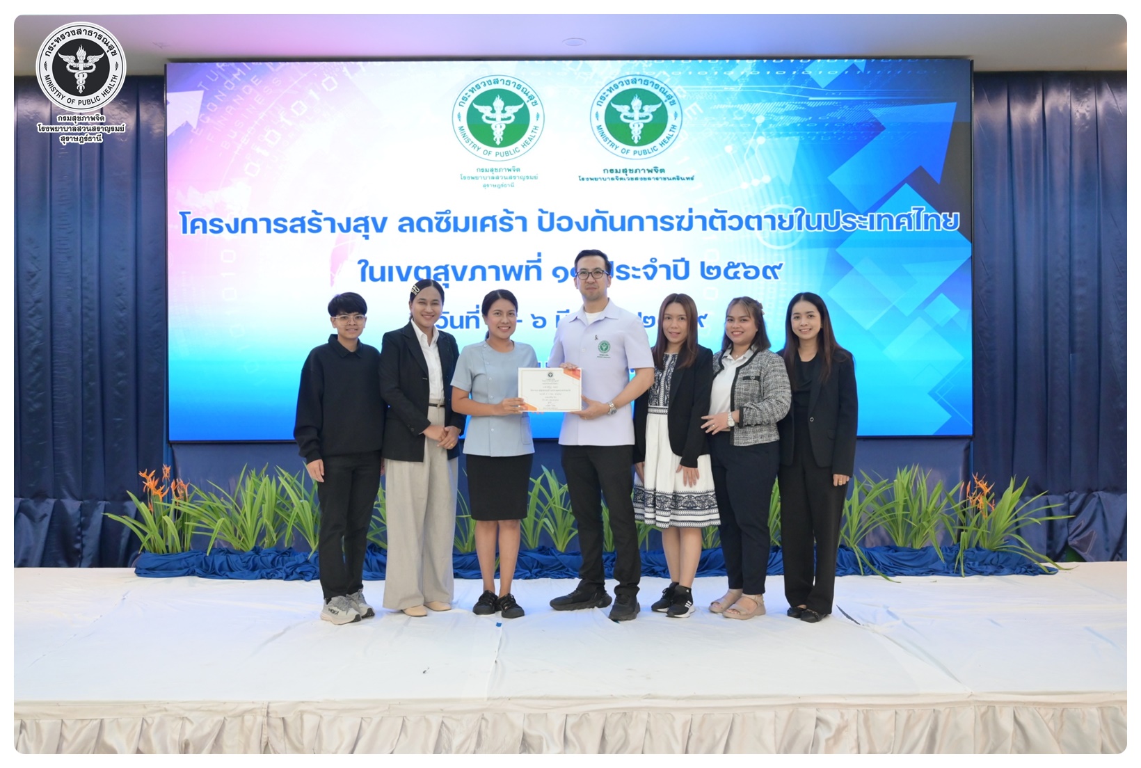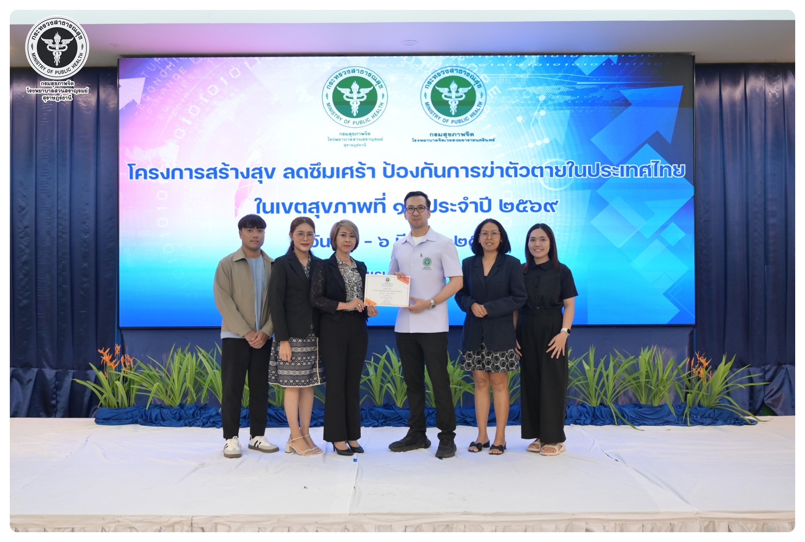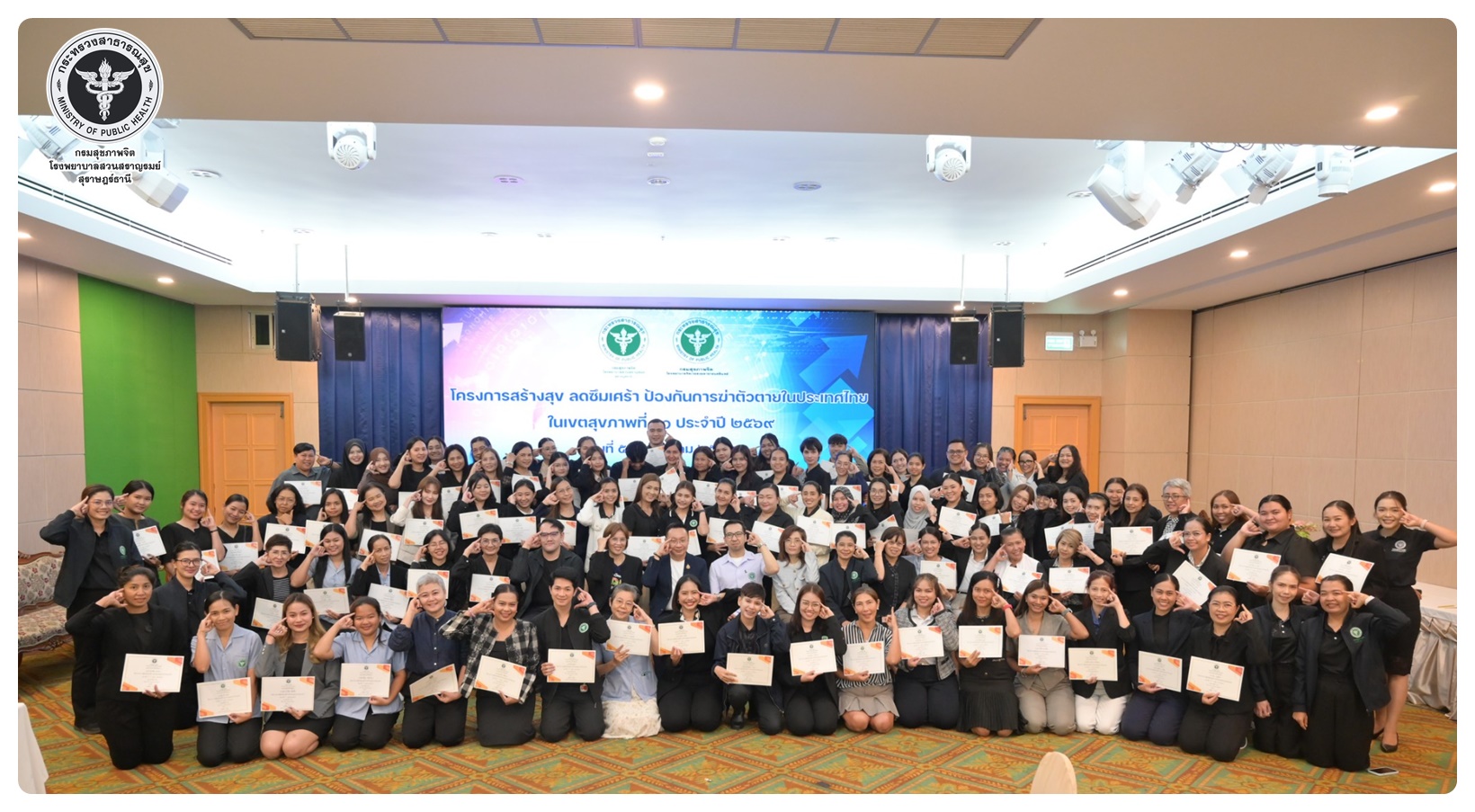 นายแพทย์ธิติพันธ์ ธานีรัตน์ ผู้อำนวยการโรงพยาบาลสวนสราญรมย์ เป็นประธานในโครงการสร้างสุข ลดซึมเศร้า ป้องกันการฆ่าตัวตายในประเทศไทย ในเขตสุขภาพที่ 11 กิจกรรมที่ 1 ประชุมเชิงปฏิบัติการพัฒนาศักยภาพบุคลากรและขับเคลื่อนการดูแลผู้ป่วยโรคซึมเศร้าและป้องกันแก้ไขปัญหาการฆ่าตัวตายในเขตสุขภาพที่ 11 โดยมี นายแพทย์ไพโรจน์ เสรีเด่นชัย นายแพทย์ชำนาญการ ประธานคณะกรรมการขับเคลื่อนยุทธศาสตร์ที่ 3 เป็นผู้กล่าวรายงาน พร้อมด้วย นายแพทย์ธรณินทร์ กองสุข นายแพทย์ทรงคุณวุฒิ ให้เกียรติเป็นวิทยากรหลักในการบรรยาย มีวัตถุประสงค์เพื่อเพิ่มศักยภาพ บุคลากรสาธารณสุขในพื้นที่ 7 จังหวัด ให้มีความรู้ ความเข้าใจ และทักษะในการคัดกรอง เฝ้าระวัง ดูแล และส่งต่อผู้ป่วยโรคซึมเศร้าและการสอบสวนโรคในผู้พยายามฆ่าตัวตายได้อย่างเหมาะสม ผู้เข้าร่วมประชุมประกอบด้วย ผู้รับผิดชอบงานสุขภาพจิตและยาเสพติดใน สสจ. รพศ. รพท. รพช. รพ.สต. ในเขตสุขภาพที่ 11 จำนวน 120 คน การประชุมจัดในรูปแบบการบรรยาย และการฝึกภาคปฏิบัติ ณ ห้องประชุมทับทิม 1 โรงแรมไดมอนต์ พลาซ่า อำเภอเมือง จังหวัดสุราษฎร์ธานี
