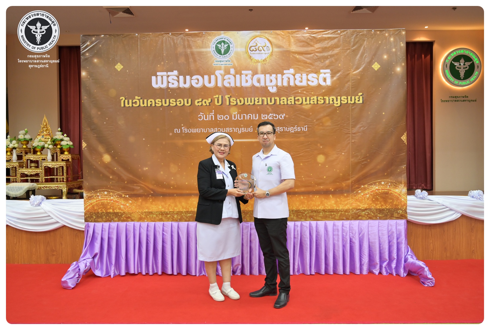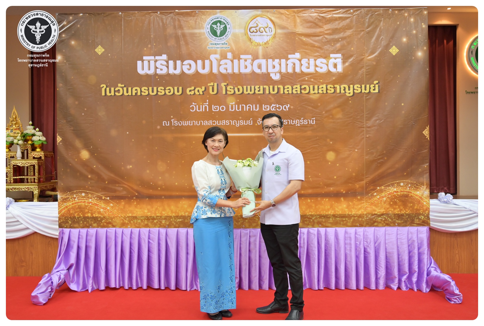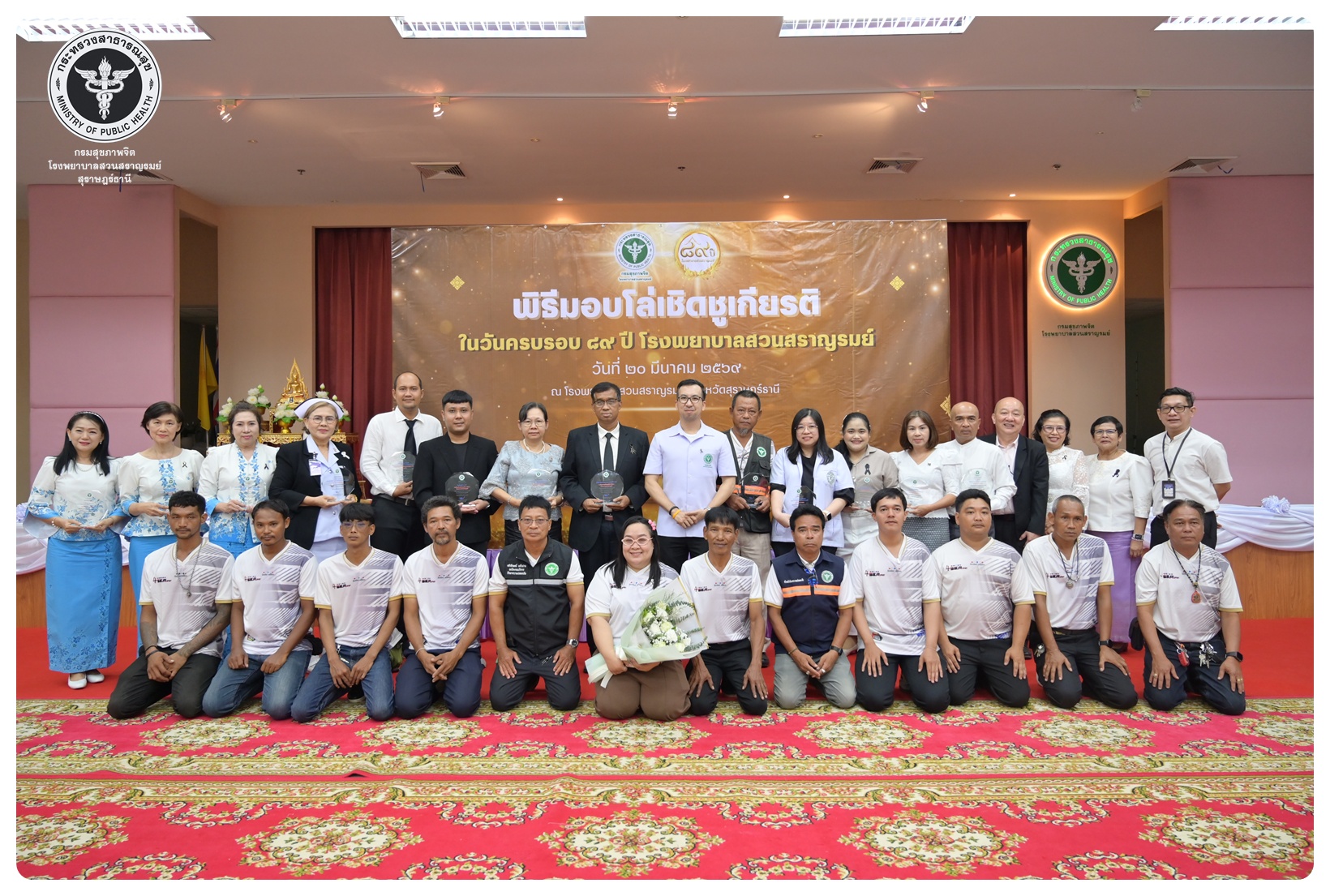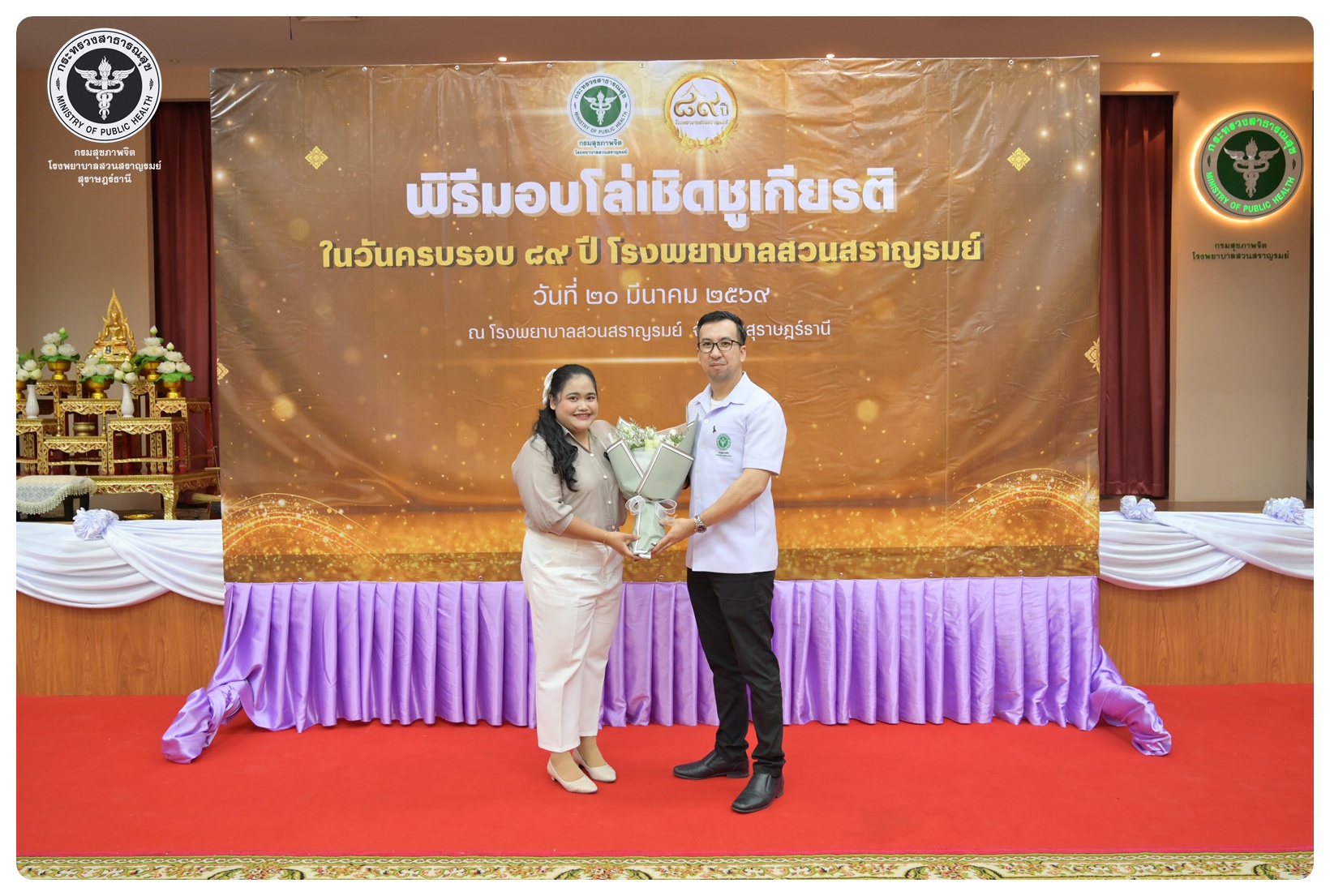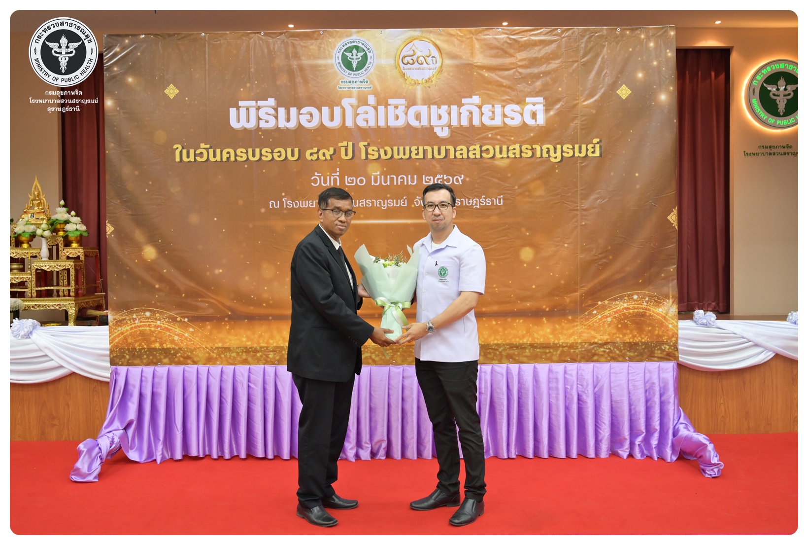 นายแพทย์กิตติศักดิ์ อักษรวงศ์ อธิบดีกรมสุขภาพจิต มอบหมายให้ นายแพทย์ธิติพันธ์ ธานีรัตน์ ผู้อำนวยการโรงพยาบาลสวนสราญรมย์ เป็นประธานในพิธี วันครบรอบ ๘๙ ปี วันคล้ายวันก่อตั้งโรงพยาบาลสวนสราญรมย์ วันที่ ๒๐ มีนาคม ๒๕๖๙ โดยมี แพทย์หญิงคัคนางค์ วาณิชย์เจริญ ผู้อำนวยการสถาบันสุขภาพจิตเด็กและวัยรุ่นภาคใต้ คณะที่ปรึกษาโรงพยาบาลสวนสราญรมย์ ผู้บริหารและบุคลากร ร่วมพิธี ดังนี้