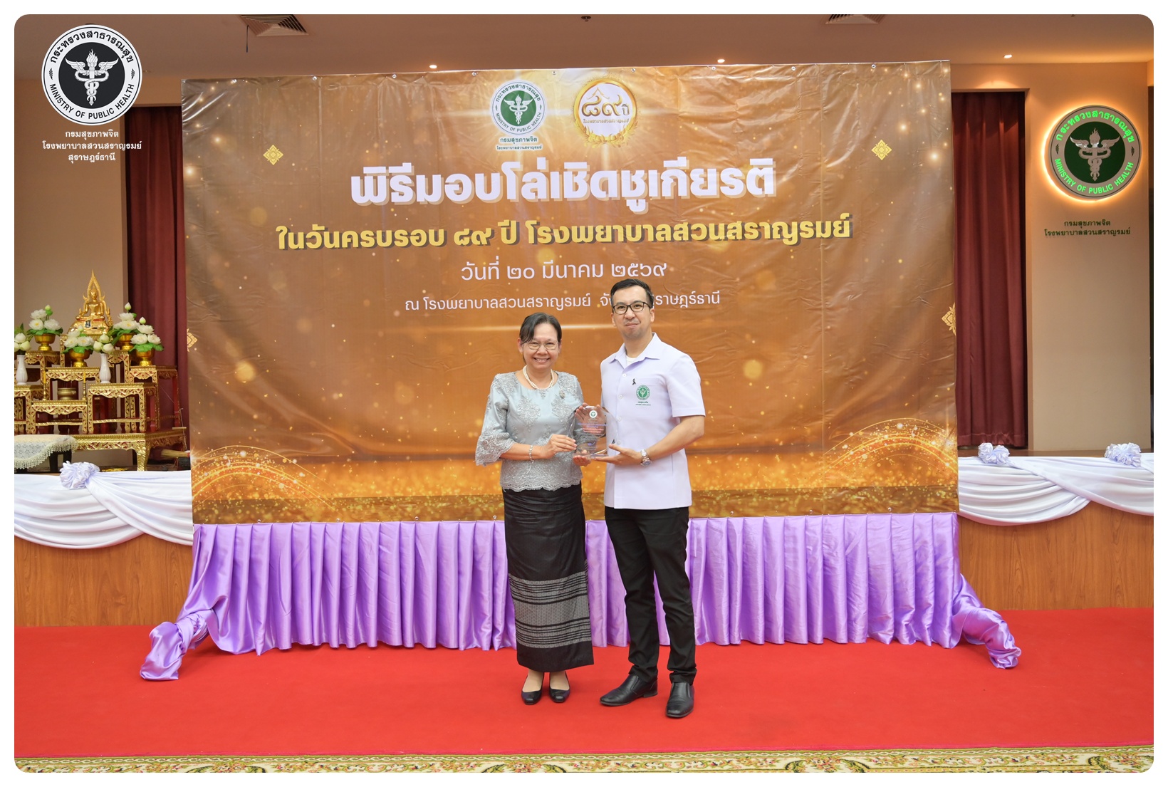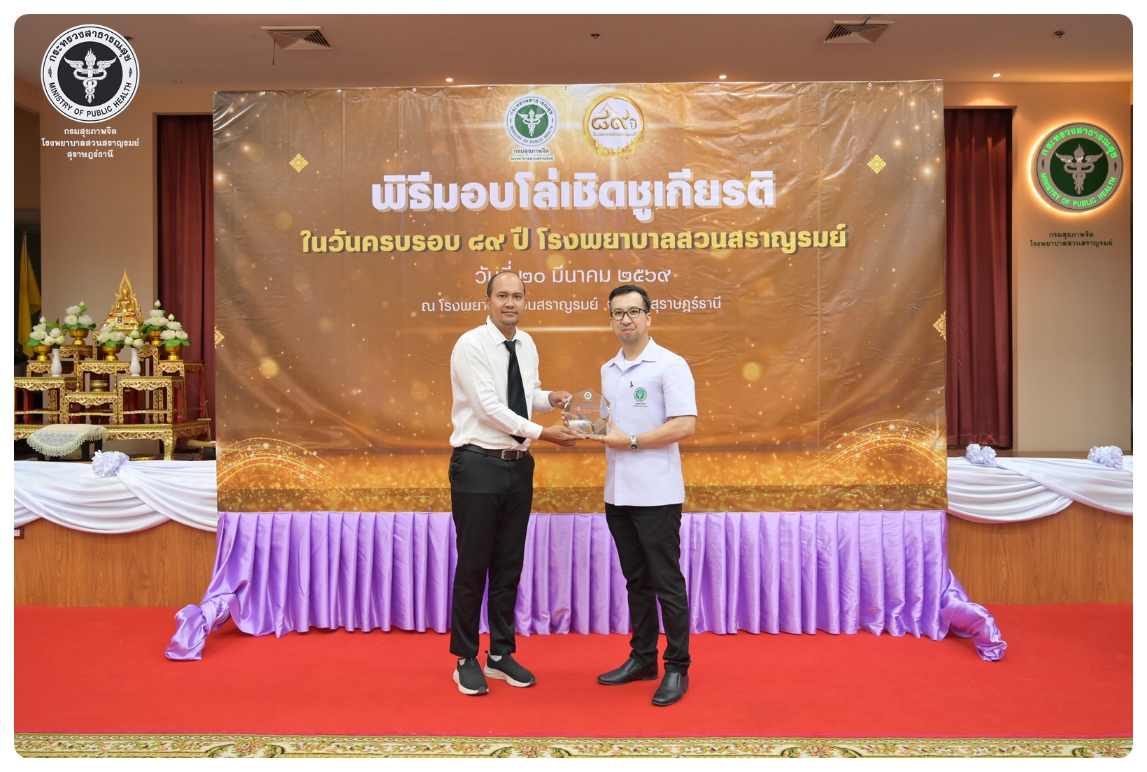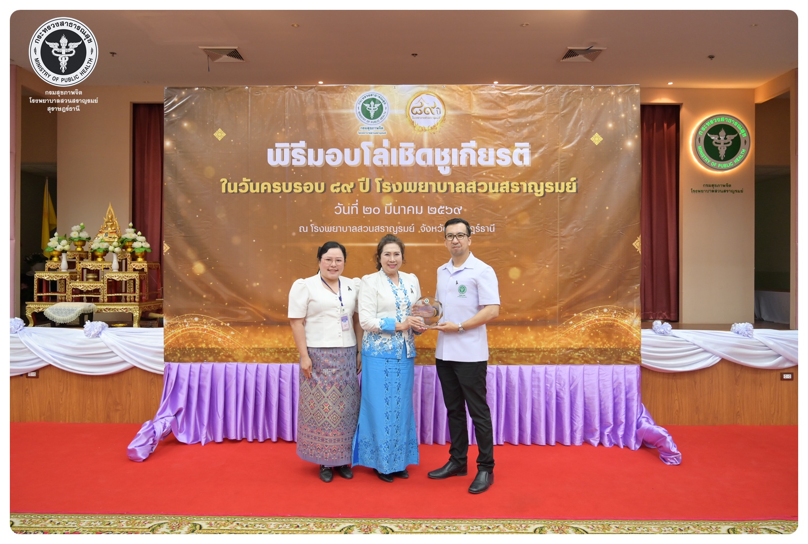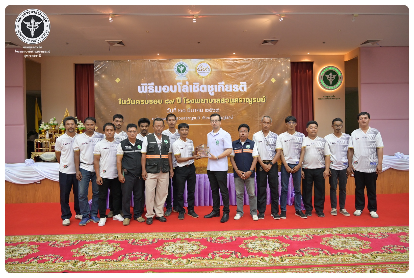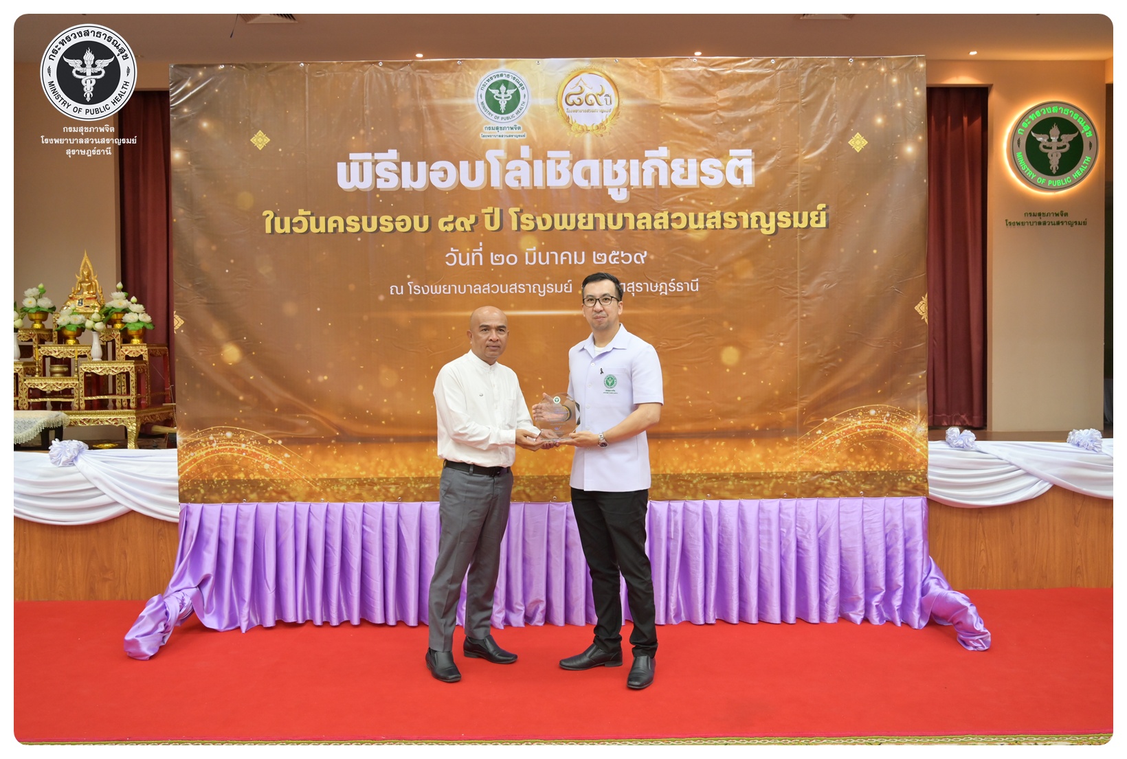 นายแพทย์กิตติศักดิ์ อักษรวงศ์ อธิบดีกรมสุขภาพจิต มอบหมายให้ นายแพทย์ธิติพันธ์ ธานีรัตน์ ผู้อำนวยการโรงพยาบาลสวนสราญรมย์ เป็นประธานในพิธี วันครบรอบ ๘๙ ปี วันคล้ายวันก่อตั้งโรงพยาบาลสวนสราญรมย์ วันที่ ๒๐ มีนาคม ๒๕๖๙ โดยมี แพทย์หญิงคัคนางค์ วาณิชย์เจริญ ผู้อำนวยการสถาบันสุขภาพจิตเด็กและวัยรุ่นภาคใต้ คณะที่ปรึกษาโรงพยาบาลสวนสราญรมย์ ผู้บริหารและบุคลากร ร่วมพิธี ดังนี้