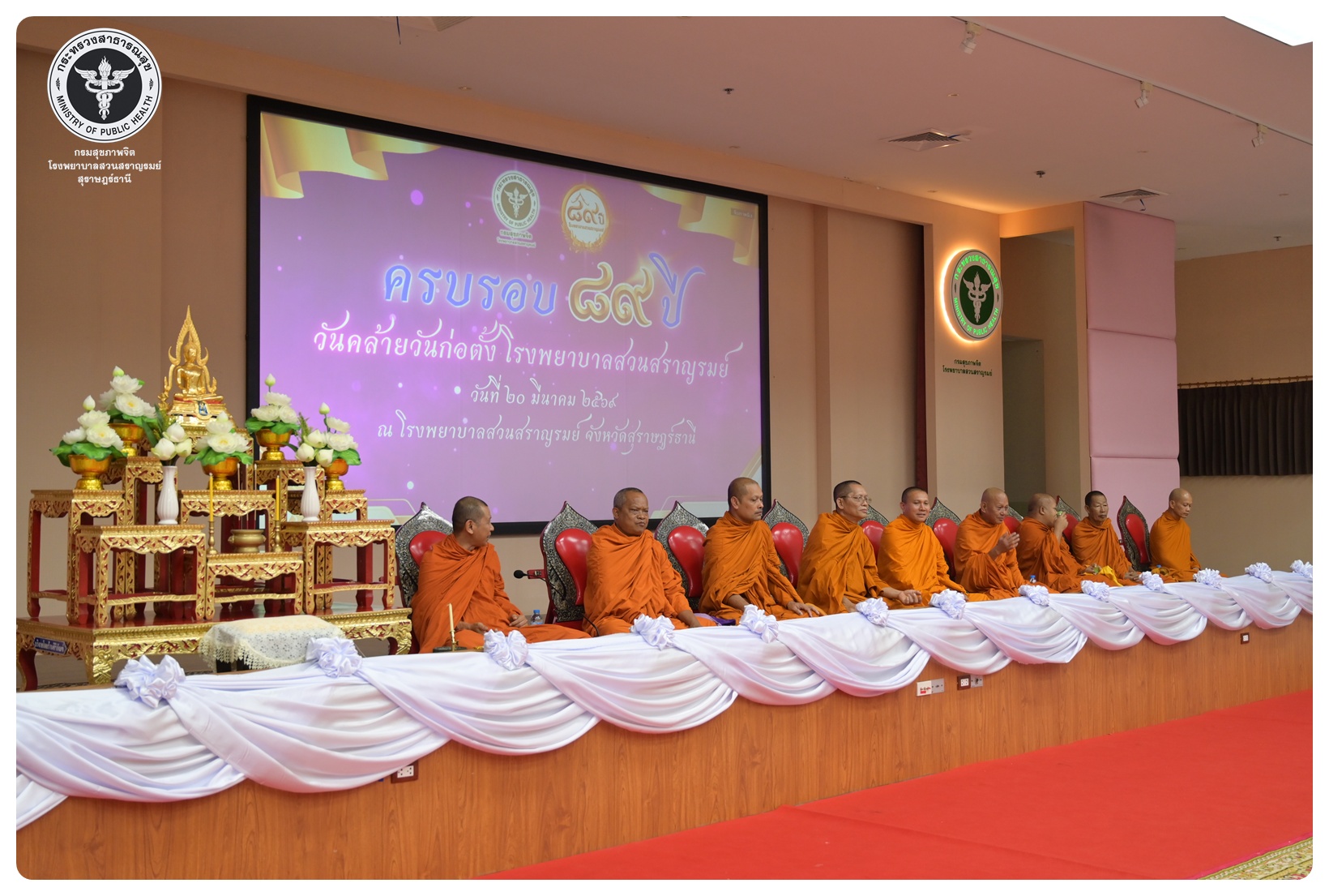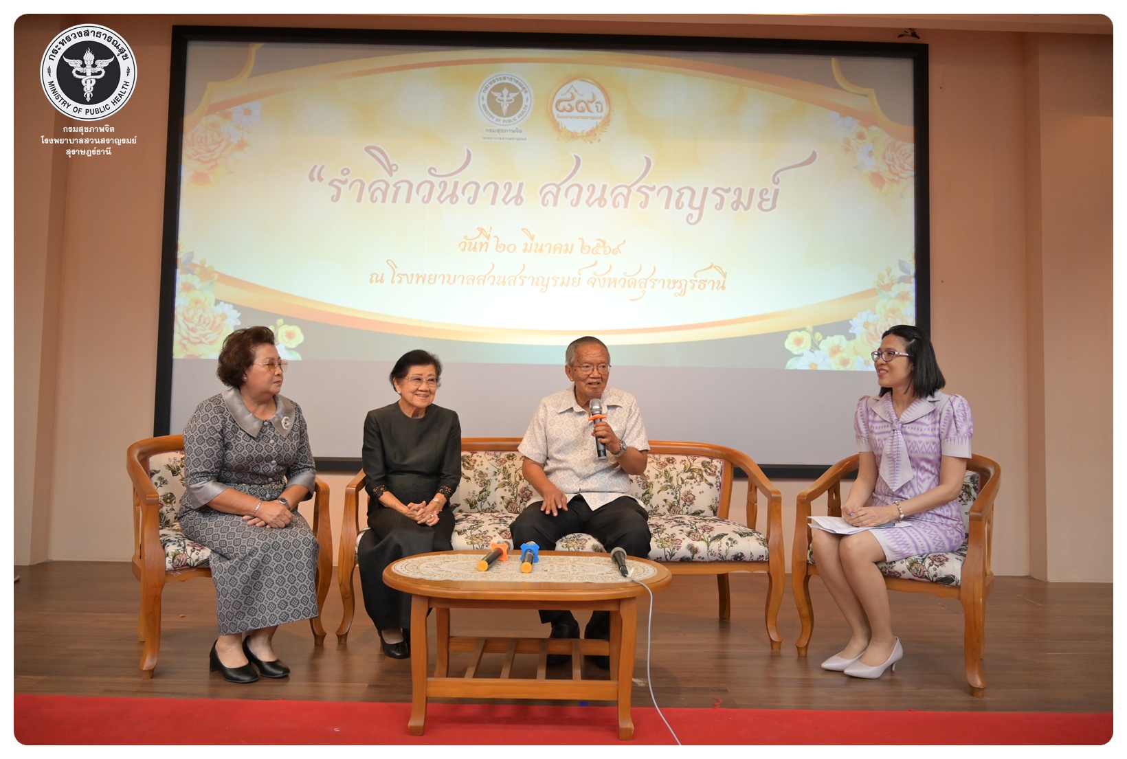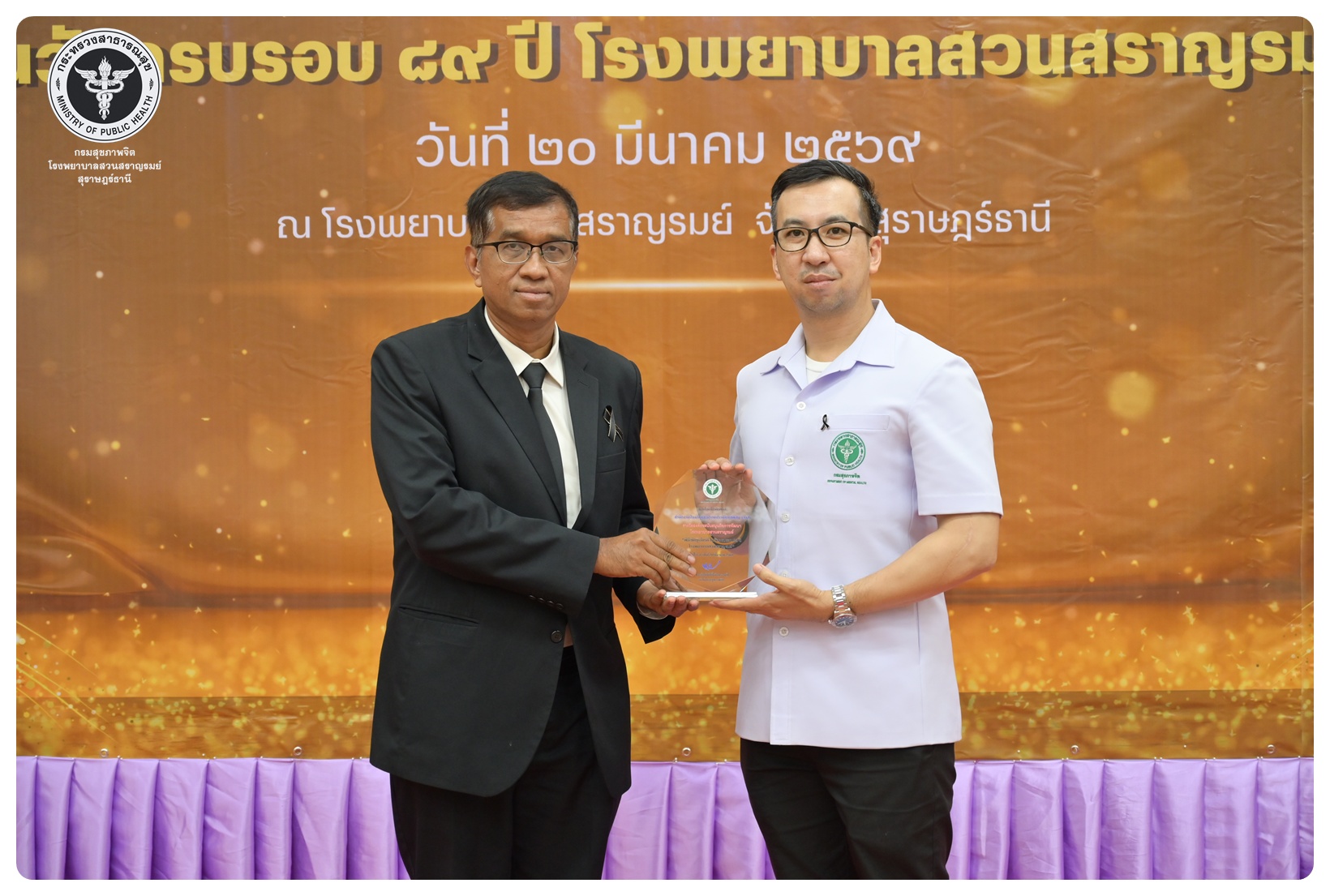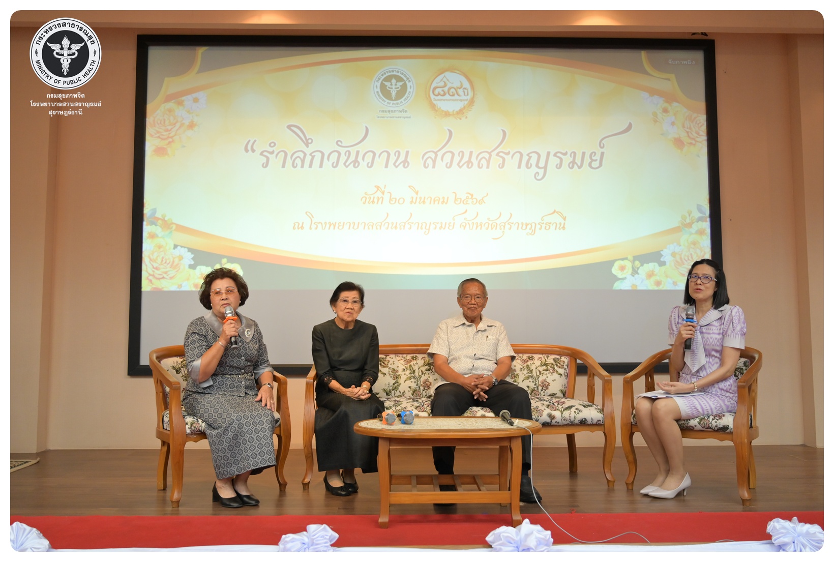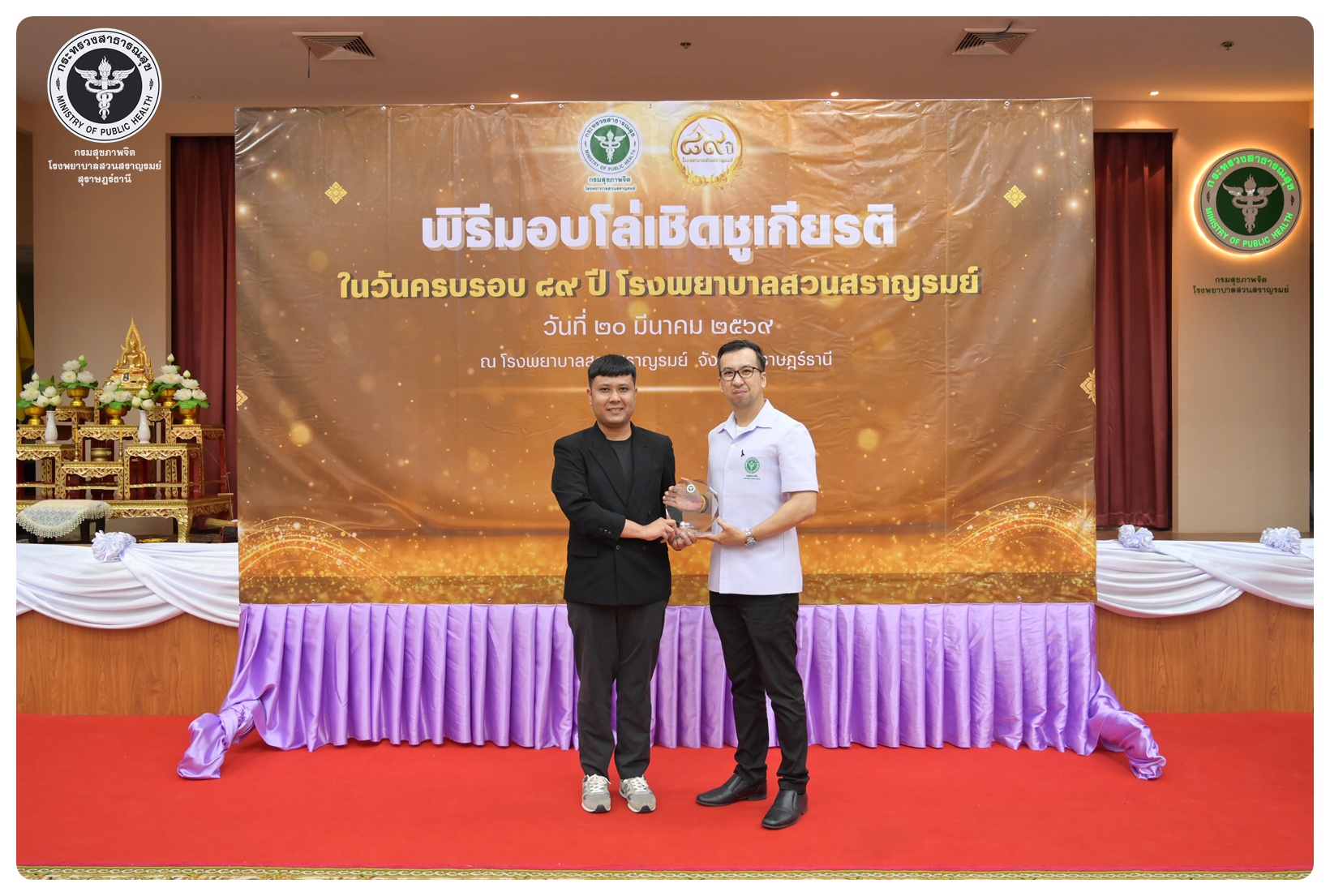 นายแพทย์กิตติศักดิ์ อักษรวงศ์ อธิบดีกรมสุขภาพจิต มอบหมายให้ นายแพทย์ธิติพันธ์ ธานีรัตน์ ผู้อำนวยการโรงพยาบาลสวนสราญรมย์ เป็นประธานในพิธี วันครบรอบ ๘๙ ปี วันคล้ายวันก่อตั้งโรงพยาบาลสวนสราญรมย์ วันที่ ๒๐ มีนาคม ๒๕๖๙ โดยมี แพทย์หญิงคัคนางค์ วาณิชย์เจริญ ผู้อำนวยการสถาบันสุขภาพจิตเด็กและวัยรุ่นภาคใต้ คณะที่ปรึกษาโรงพยาบาลสวนสราญรมย์ ผู้บริหารและบุคลากร ร่วมพิธี ดังนี้
