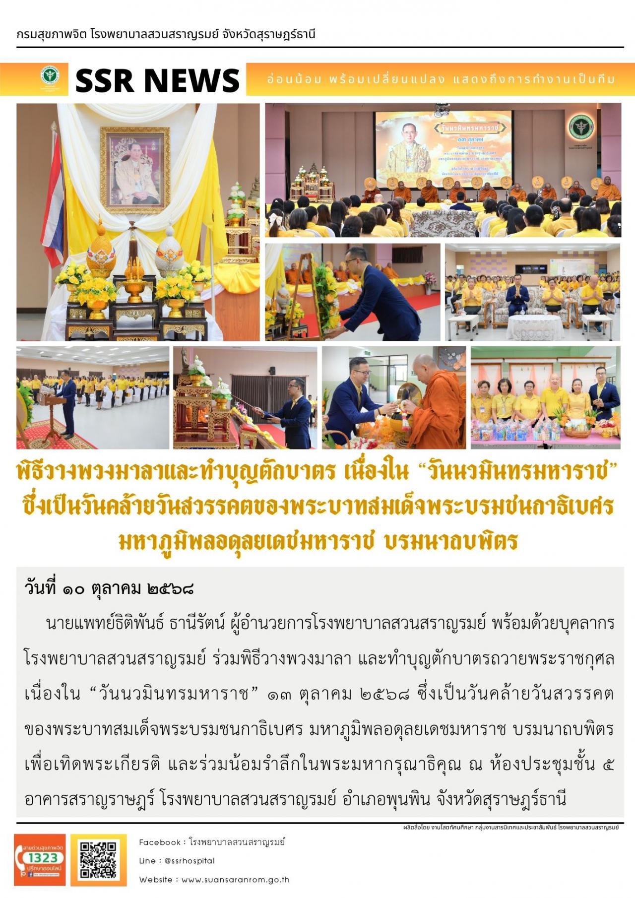พิธีวางพวงมาลาและทำบุญตักบาตร เนื่องใน “วันนวมินทรมหาราช” ซึ่งเป็นวันคล้ายวันสวรรคตของพระบาทสมเด็จพระบรมชนกาธิเบศร มหาภูมิพลอดุลยเดชมหาราช บรมนาถบพิตร